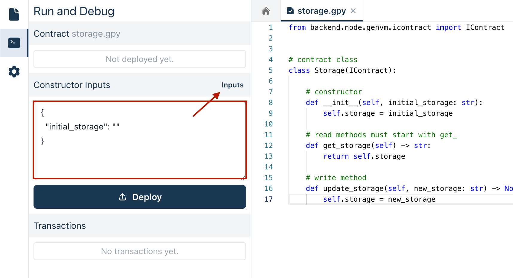 Once you have loaded your Intelligent Contract into the GenLayer Studio, the next step is to set the constructor parameters and deploy it. The constructor parameters are essential inputs that initialize the state of your contract.
